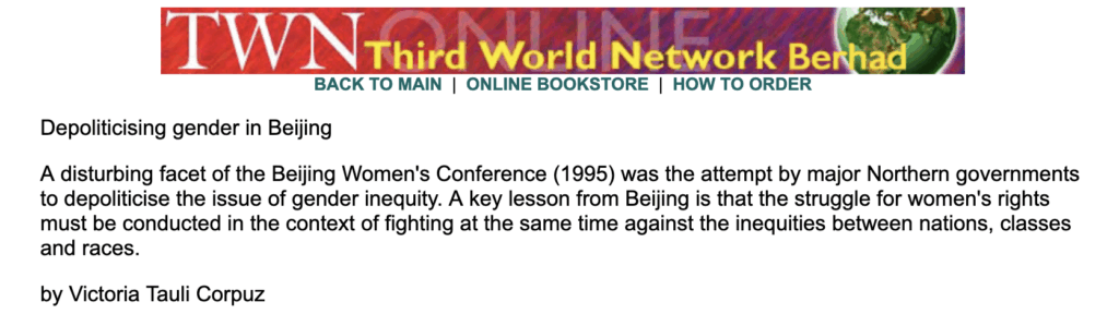 A disturbing facet of the Beijing Women's Conference (1995) was the attempt by major Northern governments to depoliticise the issue of gender inequity. A key lesson from Beijing is that the struggle for women's rights must be conducted in the context of fighting at the same time against the inequities between nations, classes and races.